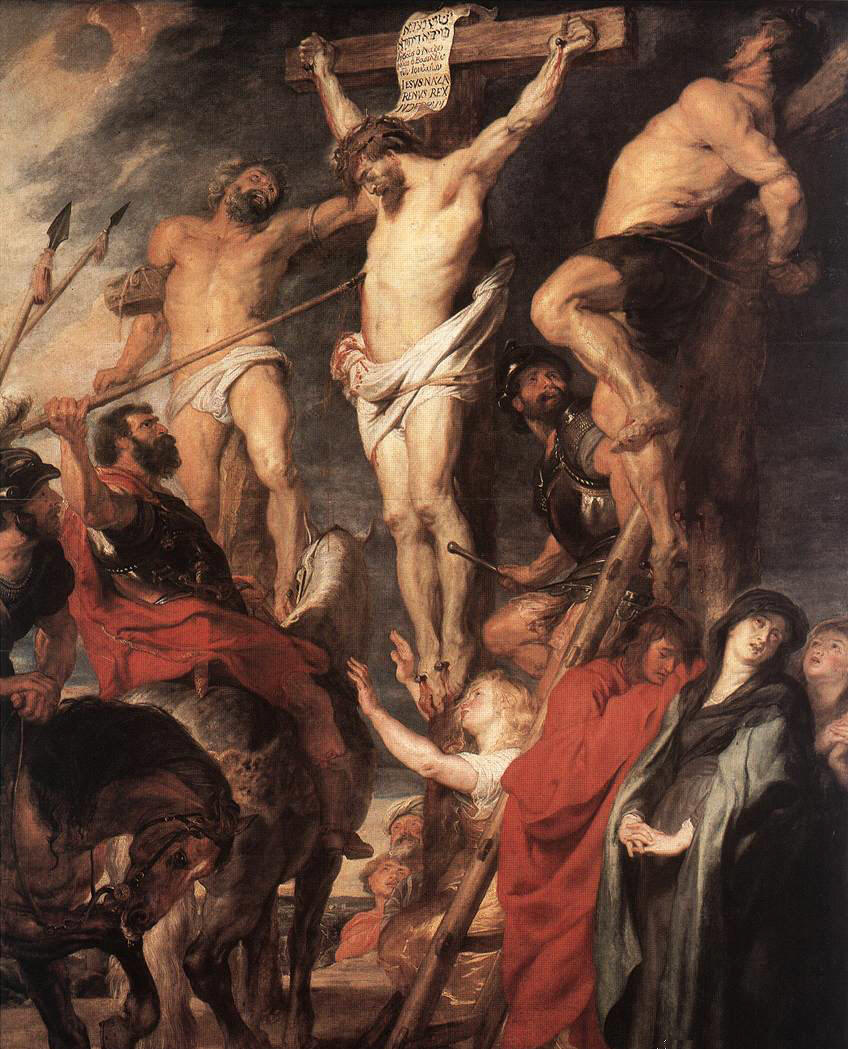 Now on the festival day he was wont to release unto them one of the prisoners, whomsoever they demanded. And there was one called Barabbas, who was put in prison with some seditious men, who in the sedition had committed murder. And when the multitude was come up, they began to desire that he would do, as he had ever done unto them. And Pilate answered them, and said: Will you that I release to you the king of the Jews? For he knew that the chief priests had delivered him up out of envy. But the chief priests moved the people, that he should rather release Barabbas to them. And Pilate again answering, saith to them: What will you then that I do to the king of the Jews? But they again cried out: Crucify him. And Pilate saith to them: Why, what evil hath he done? But they cried out the more: Crucify him. And so Pilate being willing to satisfy the people, released to them Barabbas, and delivered up Jesus, when he had scourged him, to be crucified. And the soldiers led him away into the court of the palace, and they called together the whole band: And they clothe him with purple, and platting a crown of thorns, they put it upon him. And they began to salute him: Hail, king of the Jews. And they struck his head with a reed: and they did spit on him. And bowing their knees, they adored him. And after they had mocked him, they took off the purple from him, and put his own garments on him, and they led him out to crucify him. And they forced one Simon a Cyrenian who passed by, coming out of the country, the father of Alexander and of Rufus, to take up his cross. And they bring him into the place called Golgotha, which being interpreted is, The place of Calvary. And they gave him to drink wine mingled with myrrh; but he took it not. And crucifying him, they divided his garments, casting lots upon them, what every man should take. And it was the third hour, and they crucified him. And the inscription of his cause was written over: THE KING OF THE JEWS. And with him they crucify two thieves; the one on his right hand, and the other on his left. And the scripture was fulfilled, which saith: And with the wicked he was reputed. And they that passed by blasphemed him, wagging their heads, and saying: Vah, thou that destroyest the temple of God, and in three days buildest it up again; Save thyself, coming down from the cross. In like manner also the chief priests mocking, said with the scribes one to another: He saved others; himself he cannot save. Let Christ the king of Israel come down now from the cross, that we may see and believe. And they that were crucified with him reviled him. And when the sixth hour was come, there was darkness over the whole earth until the ninth hour. And at the ninth hour, Jesus cried out with a loud voice, saying: Eloi, Eloi, lamma sabacthani? Which is, being interpreted, My God, my God, why hast thou forsaken me? And some of the standers by hearing, said: Behold he calleth Elias. And one running and filling a sponge with vinegar, and putting it upon a reed, gave him to drink, saying: Stay, let us see if Elias come to take him down. And Jesus having cried out with a loud voice, gave up the ghost. |