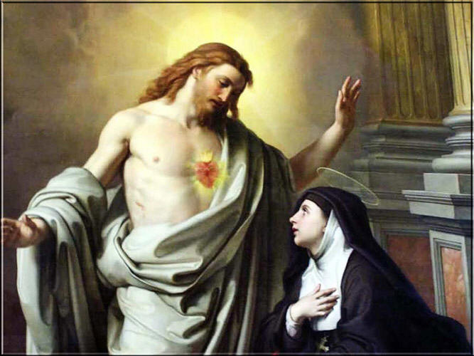 O Holy Visitandine, to hear your name is to recall the Sacred Heart Devotion, especially as practiced on First Fridays and in making reparation for sins. From early youth you dedicated yourself to Jesus and you exhibited fervent love for him in the Eucharist. You became his chosen vessel to spread the devotion to the Sacred heart which has done wonders in modern times. Make all of us realize ever more Christ's words: "Behold this Heart that has so greatly loved people." Amen.