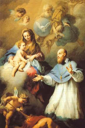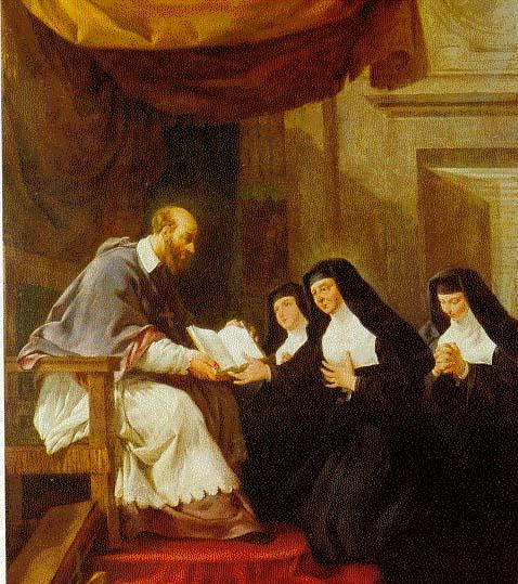 Bishop of Geneva, Doctor of the Universal Church; born at Thorens, in the Duchy of Savoy, 21 August, 1567; died at Lyons, 28 December, 1622. His father, François de Sales de Boisy, and his mother, Françoise de Sionnaz, belonged to old Savoyard aristocratic families. The future saint was the eldest of six brothers. His father intended him for the magistracy and sent him at an early age to the colleges of La Roche and Annecy. From 1583 till 1588 he studied rhetoric and humanities at the college of Clermont, Paris, under the care of the Jesuits. While there he began a course of theology. After a terrible and prolonged temptation to despair, caused by the discussions of the theologians of the day on the question of predestination, from which he was suddenly freed as he knelt before a miraculous image of Our Lady at St. Etienne-des-Grès, he made a vow of chastity and consecrated himself to the Blessed Virgin Mary. In 1588 he studied law at Padua, where the Jesuit Father Possevin was his spiritual director. He received his diploma of doctorate from the famous Pancirola in 1592. Having been admitted as a lawyer before the senate of Chambéry, he was about to be appointed senator. His father had selected one of the noblest heiresses of Savoy to be the partner of his future life, but Francis declared his intention of embracing the ecclesiastical life. A sharp struggle ensued. His father would not consent to see his expectations thwarted. Then Claude de Granier, Bishop of Geneva, obtained for Francis, on his own initiative, the position of Provost of the Chapter of Geneva, a post in the patronage of the pope. It was the highest office in the diocese, M. de Boisy yielded and Francis received Holy Orders (1593).
