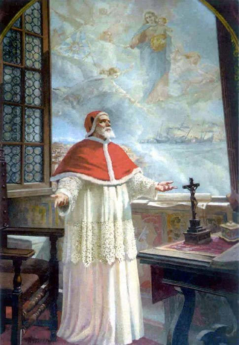 He worked incessantly to unite the Christian princes against the hereditary enemy, the Turks. In the first year of his pontificate he had ordered a solemn jubilee, exhorting the faithful to penance and almsgiving to obtain the victory from God. He supported the Knights of Malta, sent money for the fortification of the free towns of Italy, furnished monthly contributions to the Christians of Hungary, and endeavored especially to bring Maximilian, Philip II, and Charles I together for the defense of Christendom. In 1567 for the same purpose he collected from all convents one-tenth of their revenues. In 1570 when Solyman II attacked Cyprus, threatening all Christianity in the West, he never rested till he united the forces of Venice, Spain, and the Holy See. He sent his blessing to Don John of Austria, the commander-in-chief of the expedition, recommending him to leave behind all soldiers of evil life, and promising him the victory if he did so. He ordered public prayers, and increased his own supplications to heaven. On the day of the Battle of Lepanto, 7 Oct., 1571, he was working with the cardinals, when, suddenly, interrupting his work opening the window and looking at the sky, he cried out, "A truce to business; our great task at present is to thank God for the victory which He has just given the Christian army". He burst into tears when he heard of the victory, which dealt the Turkish power a blow from which it never recovered. In memory of this triumph he instituted for the first Sunday of October the feast of the Rosary, and added to the Litany of Loreto the supplication "Help of Christians". He was hoping to put an end to the power of Islam by forming a general alliance of the Italian cities Poland, France, and all Christian Europe, and had begun negotiations for this purpose when he died of gravel, repeating "O Lord, increase my sufferings and my patience!" He left the memory of a rare virtue and an unfailing and inflexible integrity. He was beatified by Clement X in 1672, and canonized by Clement XI in 1712.